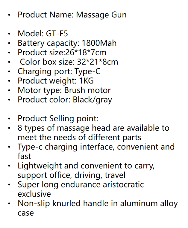 A2: The model number of this massager gun is GT-F5